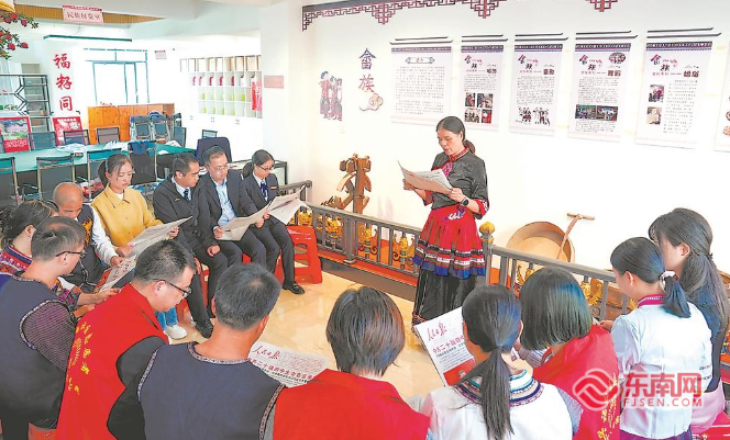 24日,周宁县狮城镇兴福社区活动室内,社区干部用畲语向畲族群众宣讲党的二十届四中全会精神。