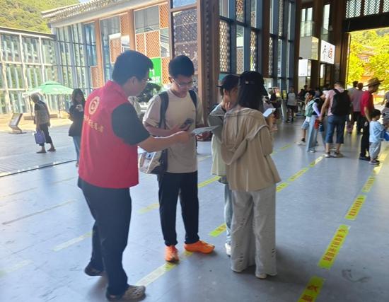 在石牛山景区,“智慧大脑”24小时运转,是文明旅游的无声守护者,编织起一张文明与科技交织的服务网:智慧指挥中心实时跳动,精准监测各区域游客密度,通过实时数据调度客流;售票大厅内,身着“红马甲”的志愿者一边协助游客扫码购票,一边用方言为老年群体讲解操作流程,温馨的对话声中,10分钟内便为12组家庭完成无接触购票。游客王女士赞叹,从高效购票引导到游览中的垃圾分类提醒,连拍照打卡点都有志愿者帮忙取景,科技的精准与贴心的体验在这里悄然融入每一步旅程。