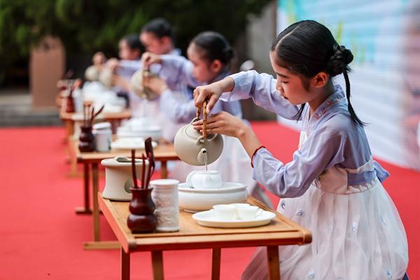 活动在《大地飞歌》的歌声中拉开帷幕,折子戏、少儿茶艺表演、南音表演……精彩节目一一上演。随后,中国制茶大师陈两固携手家族四代人共同浇灌为茶乡人民带来幸福生活的茶树,让种茶经验、制茶技艺代代相传。茶俗敬老环节,儿孙辈们取一盏清茶敬老人,在茶香中传递亲情与敬意。茶礼赠老环节,感德镇向县老年书画研究会、县老人大学赠送了重阳敬老茶,表达对老干部的尊敬与感谢;县老年书画研究会向槐植村老年协会、槐扬村老年协会赠送对联,祝福老人健康长寿。