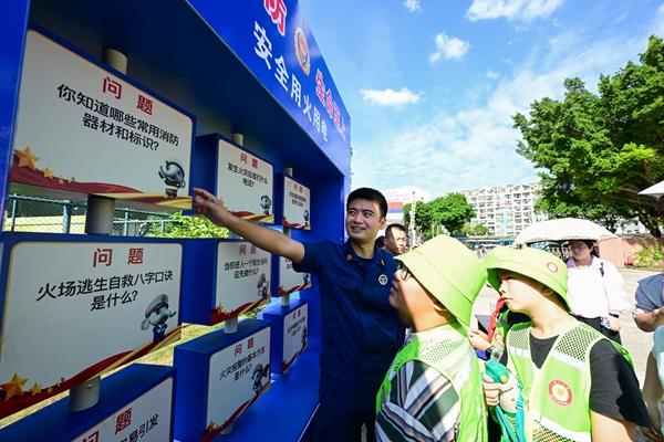 在消防安全小课堂环节,活动突破传统讲授模式,融情景模拟、案例解析与互动问答于一体,生动传授家庭防火要诀。互动体验环节中,参与者积极尝试穿戴消防战斗服、攀登6米拉梯、参与射水打靶,并有序穿越移动式浓烟逃生体验馆,模拟真实火场逃生场景。烟热室穿越挑战更设有消防车模奖励,激发亲子家庭的参与热情。安全用火用电观摩区实景演示了电动自行车及油锅起火的科学扑救方法,以直观形式警示火灾风险。最后的消防知识有奖竞答气氛热烈,参与者在问答中巩固知识,也将整场活动推向高潮。