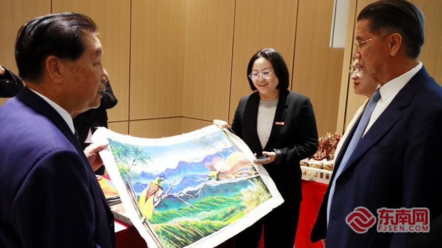 林占熺向谢西蒙展示巴新人民送他的“天堂鸟”画作。