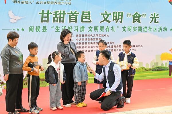文明风11月17日讯 11月15日,“甘甜首邑,文明‘食’光” ——闽侯县“生活好习惯 文明更有礼”文明实践进社区之文明餐桌主题活动在甘蔗街道瀛洲社区海峡传媒港小区举行。活动以居民喜闻乐见的多元形式,推动文明、节俭、健康的餐饮理念走进社区、融入家庭,进一步深化“明礼福建人”公共文明素养提升行动。