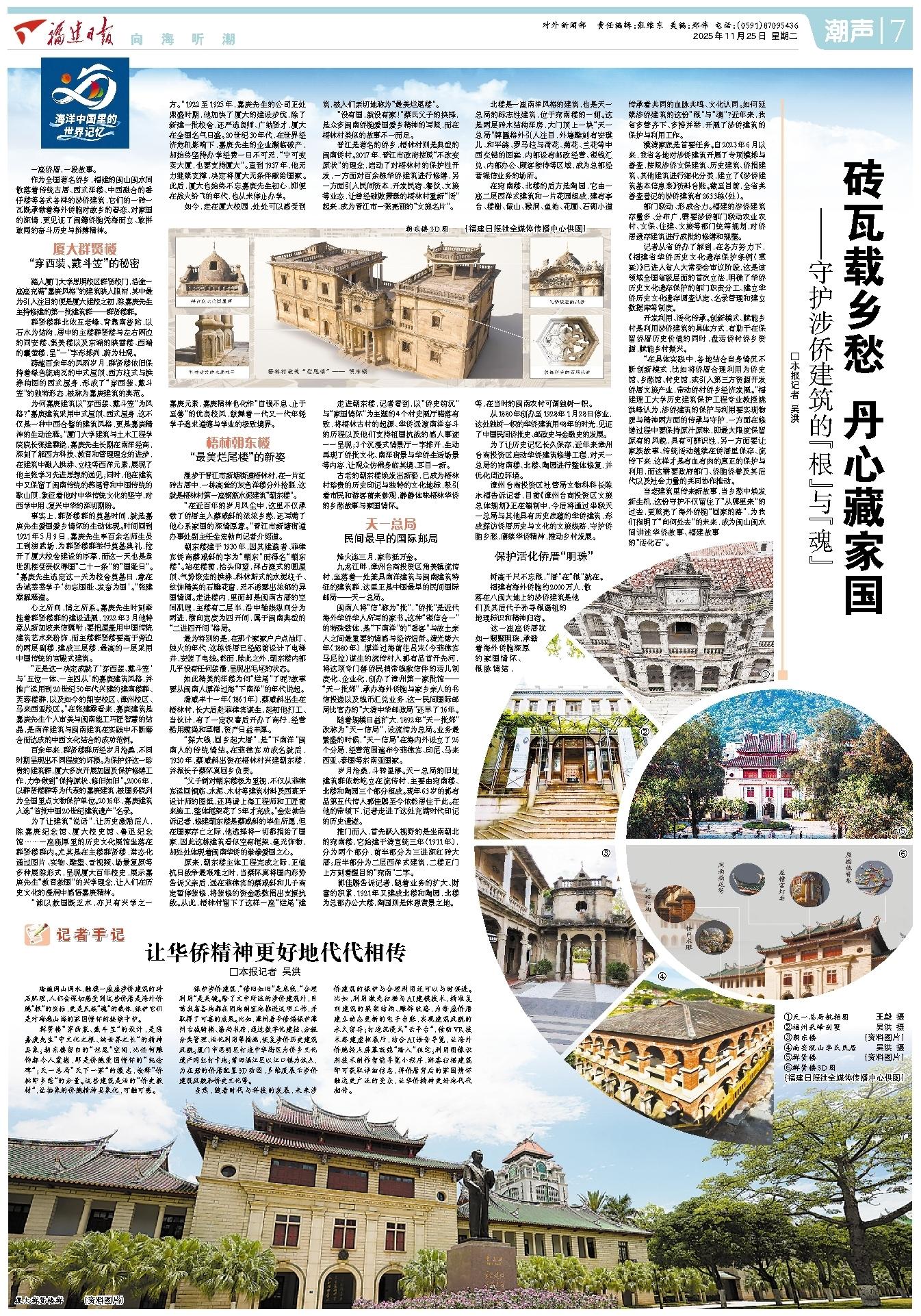踏遍闽山闽水,触摸一座座涉侨建筑的砖石肌理,人们会深切感受到这些侨厝是海外侨胞“根”的坐标,更是民族“魂”的载体,保护它们是对跨越山海的家国情怀的接续守护。