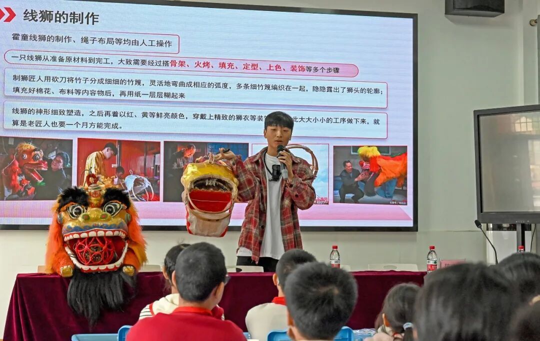 课堂上,兴贤少年线狮队队长向学生们介绍了线狮的历史渊源、文化价值以及在民间盛行的表演特点。通过生动的讲述,孩子们了解到线狮虽小,却“线牵千戏”,以灵动细腻的动作闻名,简短的介绍让学生对这门传统技艺有了更直观的认识,课堂气氛轻松又专注。