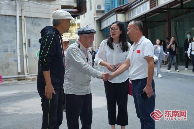 牛犇(左二)走进“百姓院子”,和陈原来(右一)亲切握手。海沧区委文明办供图