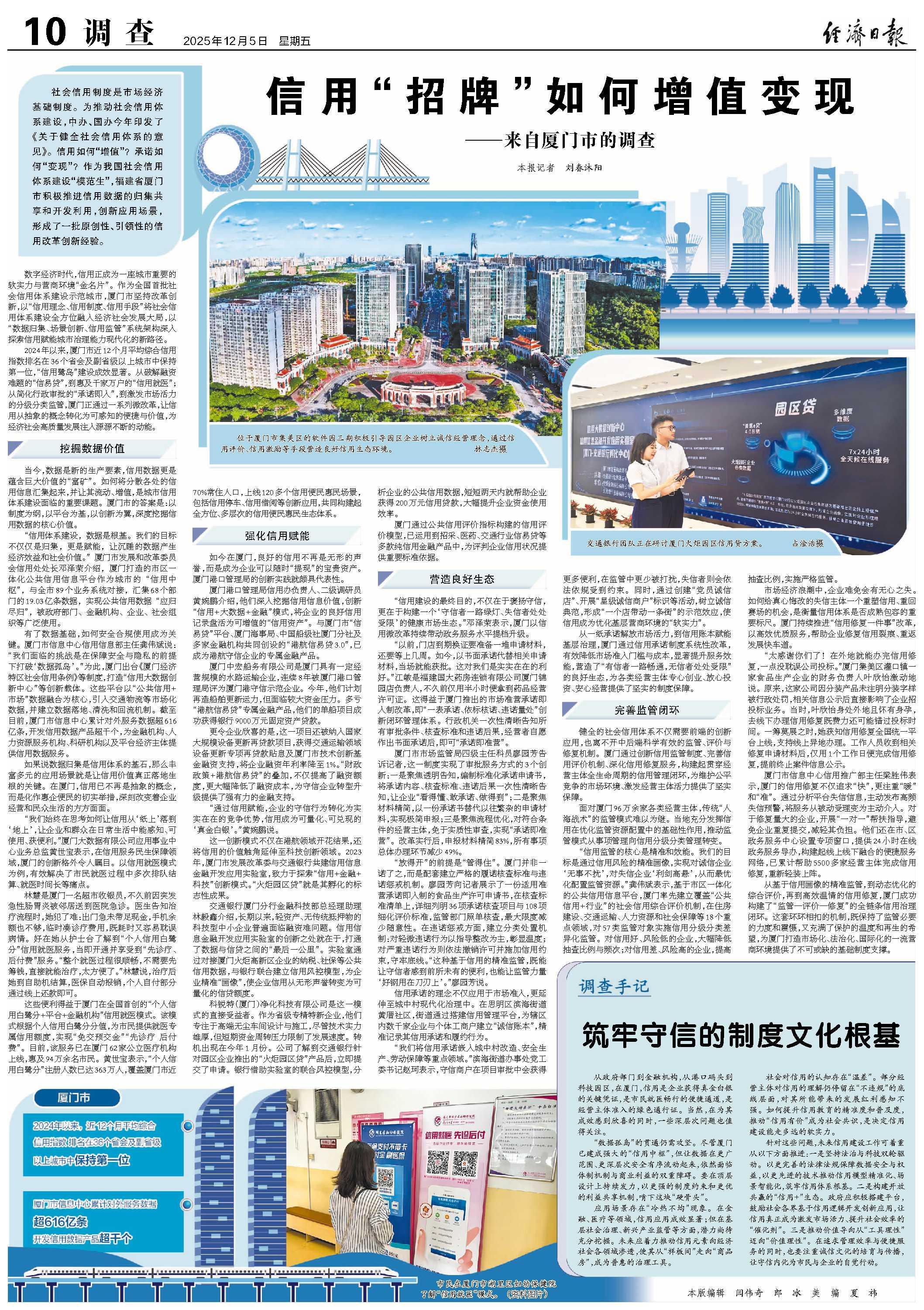 2024年以来,厦门市近12个月平均综合信用指数排名在36个省会及副省级以上城市中保持第一位,“信用鹭岛”建设成效显著。从破解融资难题的“信易贷”,到惠及千家万户的“信用就医”;从简化行政审批的“承诺即入”,到激发市场活力的分级分类监管,厦门正通过一系列微改革,让信用从抽象的概念转化为可感知的便捷与价值,为经济社会高质量发展注入源源不断的动能。
