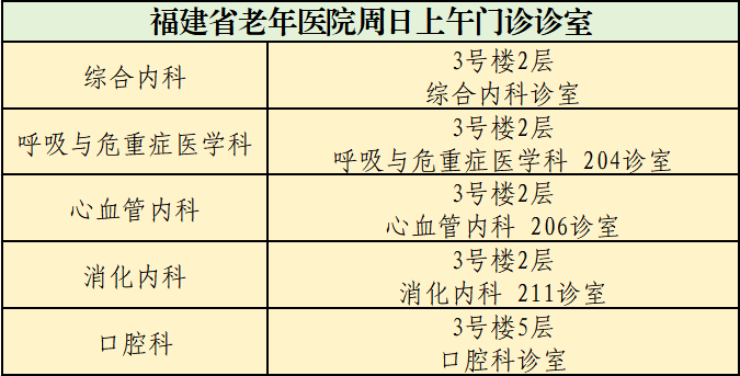 福建省老年医院从今天(12月7日)起正式推出“周日诊”服务——每周日上午将有综合内科、呼吸与危重症医学科、心血管内科、消化内科、口腔科等重点科室专家坐诊。