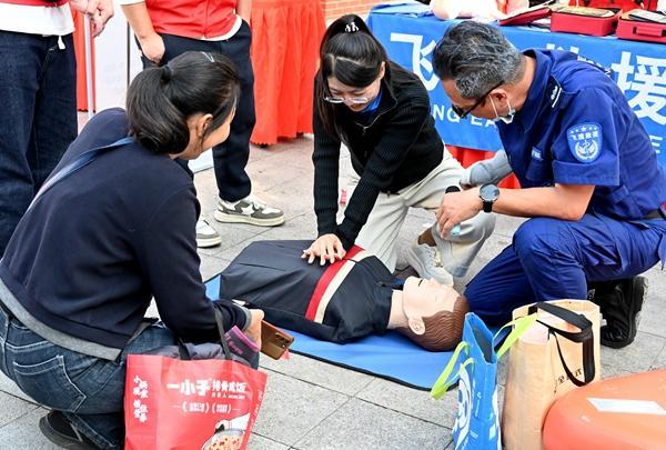 市民现场体验急救技能。(吴觅亮 摄)