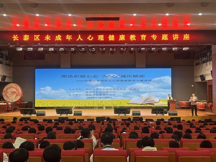文明风12月24日讯 12月23日,由长泰区委宣传部(文明办)、区教育局主办,长泰一中承办的“塑造积极心态 为‘心’减压赋能”心理健康教育专题讲座在长泰一中顺利开讲。长泰一中高二年级全体学生齐聚现场,收获了满满的心理“能量包”。