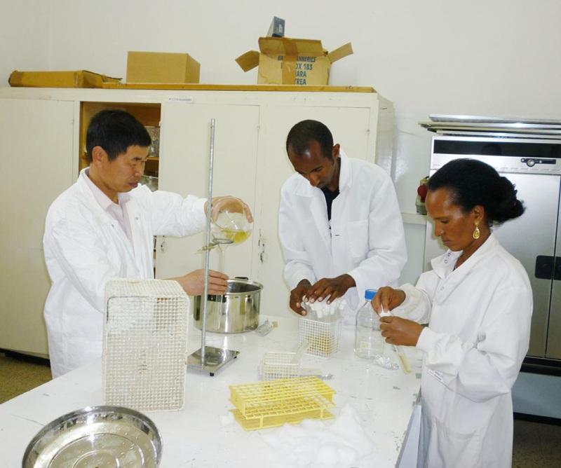 五度援外的陈克华(左一)在非洲厄立特里亚指导学员进行菌菇母种培养基制作。(受访者供图)
