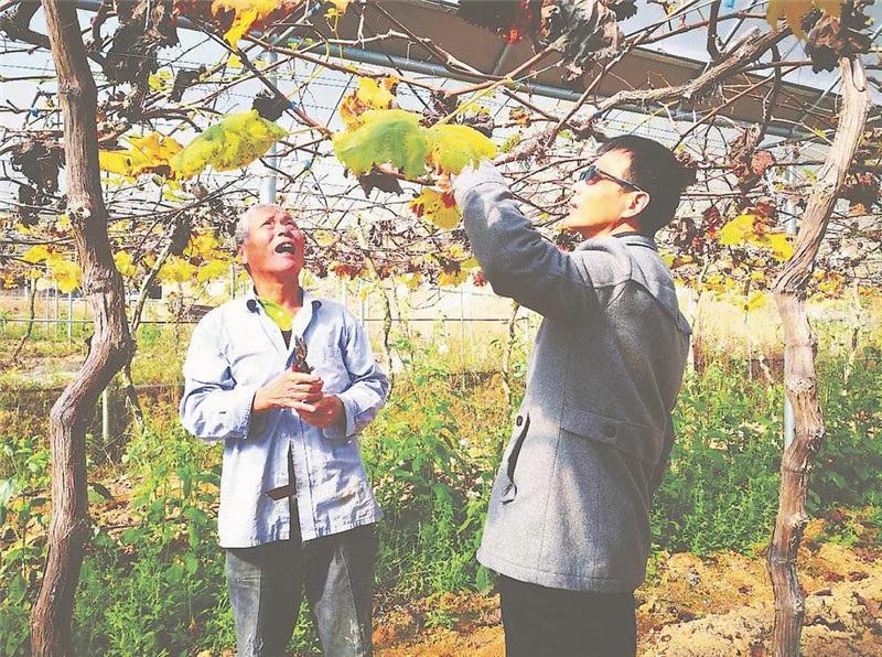 “一号科技特派员”吴敬才(右)指导果农对葡萄进行冬季修剪。(资料图片)
