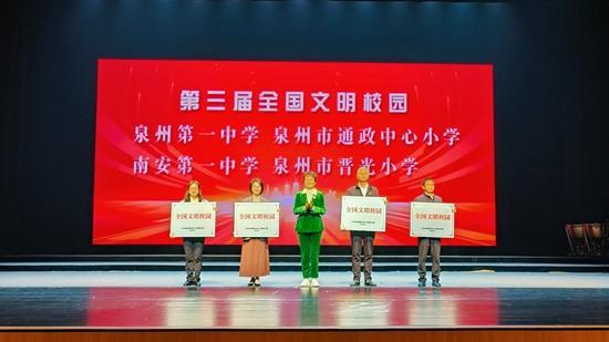 活动伊始,举行了第三届全国文明校园颁牌仪式。市领导庄灿霞分别为泉州第一中学、南安第一中学、泉州市通政中心小学、泉州市晋光小学等学校颁发荣誉牌匾。