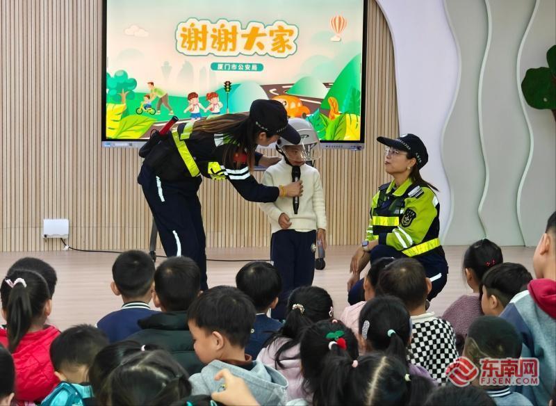 义务交警走进校园,普及安全头盔佩戴知识(集美区义务交警队供图)