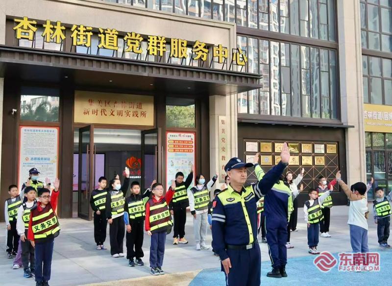 向“小小交警”教授交通指挥手势(集美区义务交警队供图)