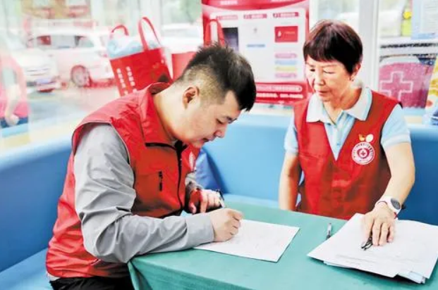 陆浩(左)在捐献血小板前进行登记。受访者供图