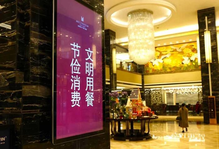 “节俭消费,文明用餐”提示在福清创元千禧大酒店随处可见