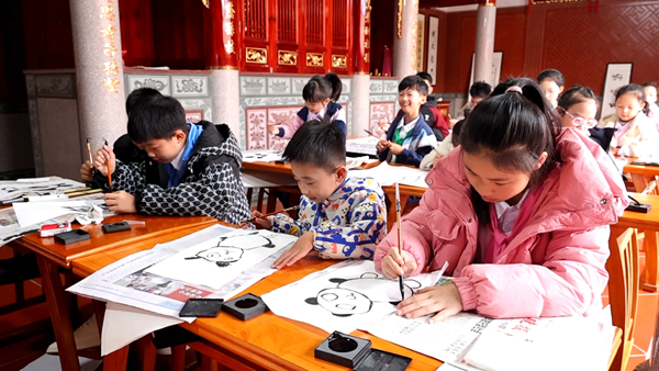 长夏书院内,孩子们勾勒出憨态可掬的大熊猫。