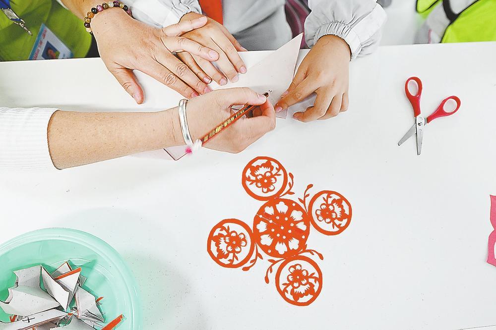 2025年11月6日午饭后,孩子们在“共享奶奶”指导下学剪纸技艺。