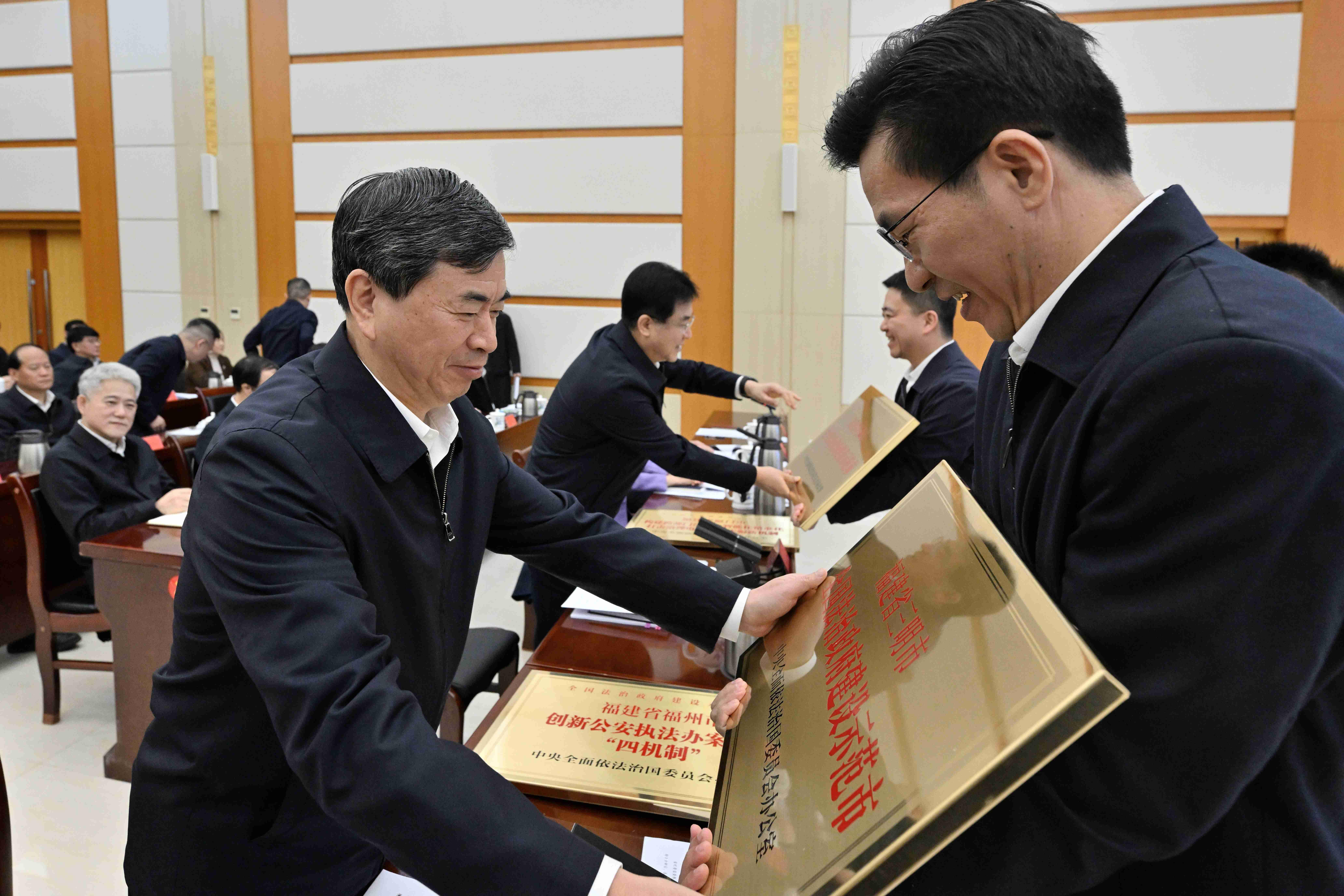 会议通报了我省法治督察情况,为我省获得第三批全国法治政府建设示范地区和项目命名的单位授牌。省纪委监委、省司法厅、省生态环境厅和福州市政府、三明市委、晋江市委、上杭县委的负责同志作了交流发言。