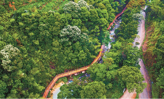沿双芦溪新建的3.2公里亲水栈道漫步,溪水清澈,风光如画。摄影爱好者迅速支起三脚架,捕捉白鹇掠过水面的瞬间。