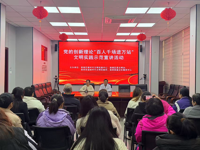 文明风1月15日讯 为深入推进党的创新理论“百人千场进万站”文明实践示范宣讲活动,精准对接群众需求,在服务群众中教育引导群众,1月13日,由鼓楼区新时代文明实践中心、区委文明办、鼓西街道新时代文明实践所、街道卫生服务中心、街道工会联合会联合主办的“百人千场进万站”示范宣讲暨健康医疗讲座活动在鼓西街道二楼会议室举行。此次活动旨在将“现代化最重要的指标还是人民健康,这是人民幸福生活的基础。”等重要论述的精神,通过具体、暖心的健康服务传递给基层群众。