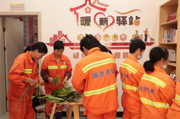 组织环卫工人在“暖”新驿站包粽子。来源:宁化县融媒体中心