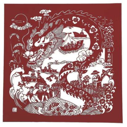 剪纸作品《龙腾澳角鱼满舱》