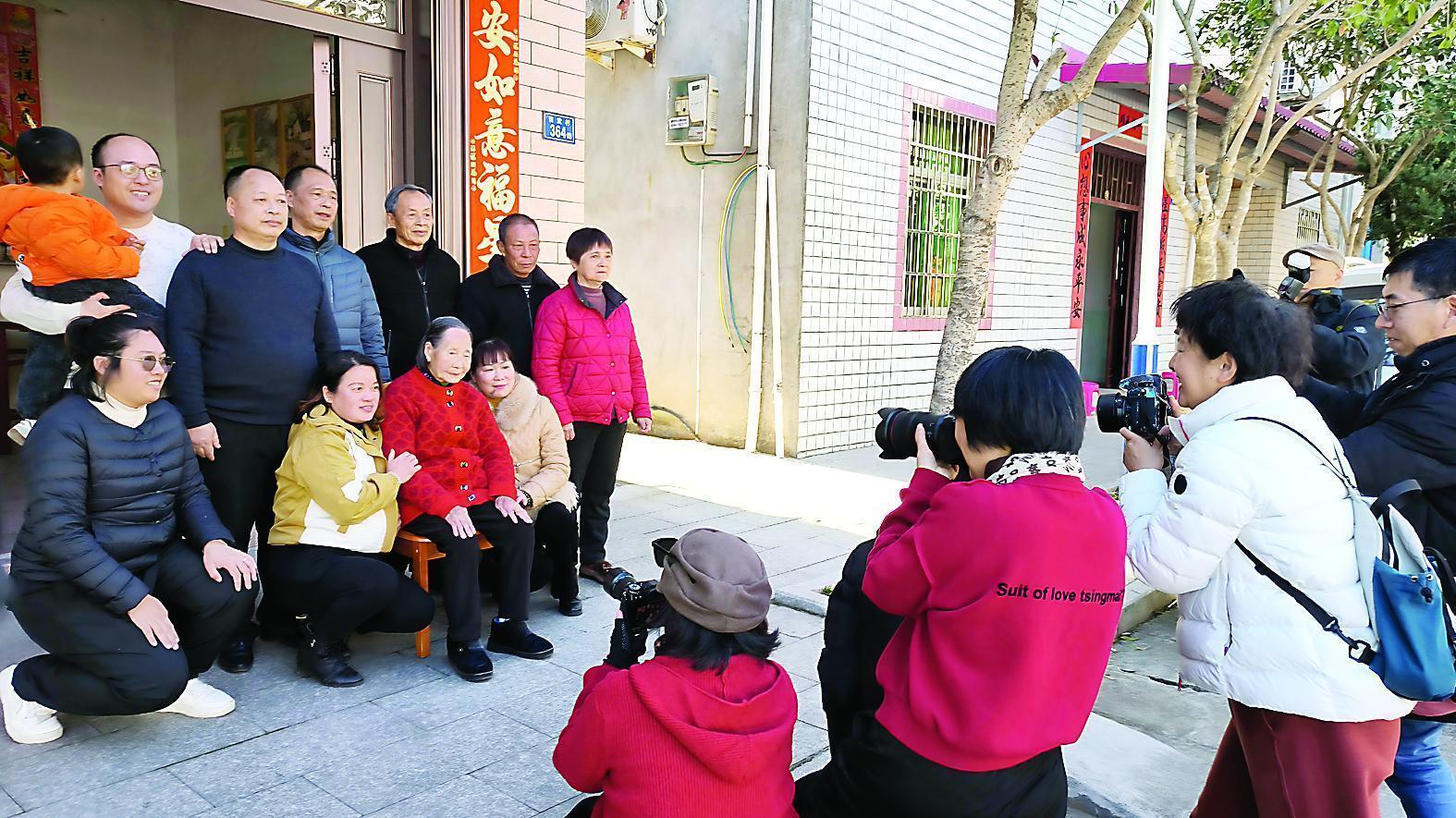 镜头前,95岁的村民陈德恩笑容和蔼,与家人在自家屋前幸福合影。一张张绽放的笑脸,洋溢着对新年的美好憧憬,清脆的快门声此起彼伏,摄影家用镜头定格下一个个团圆的温馨瞬间。