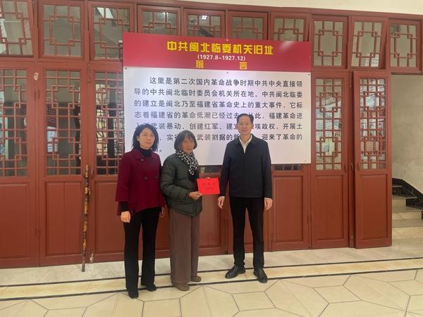在中共闽北临时委员会旧址纪念馆内,吴孔盛与沙无泞亲切交谈,仔细询问她的身体状况和生活情况,对她几十年如一日守护革命旧址、义务讲解红色历史的奉献精神表示高度赞扬。