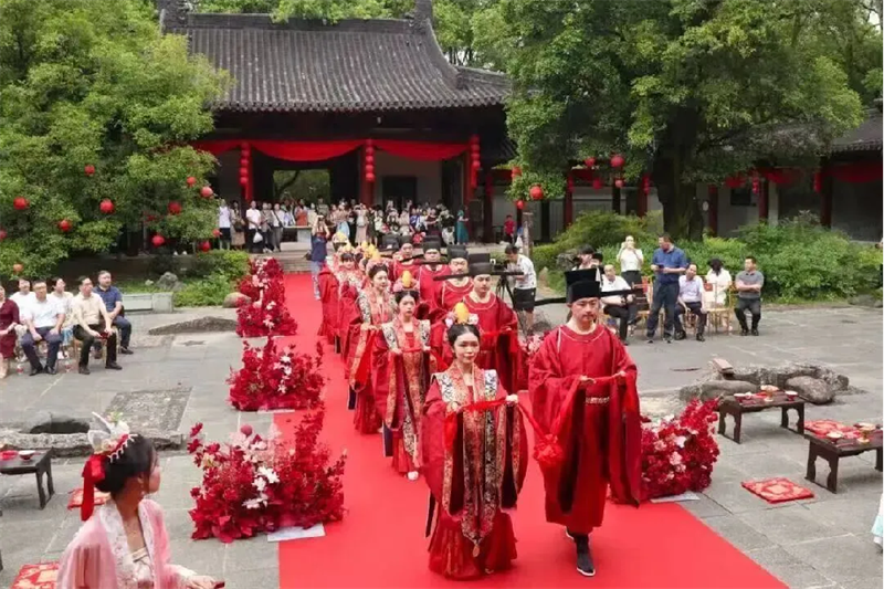 2025年,首批“跨省通办”新人在武夷山春秋馆举行朱子婚礼。(南平市委文明办 供图)