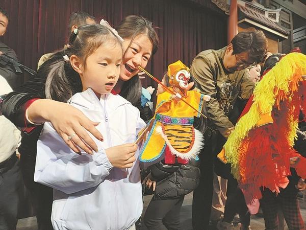 小朋友在体验操纵布袋木偶。 张子言 摄