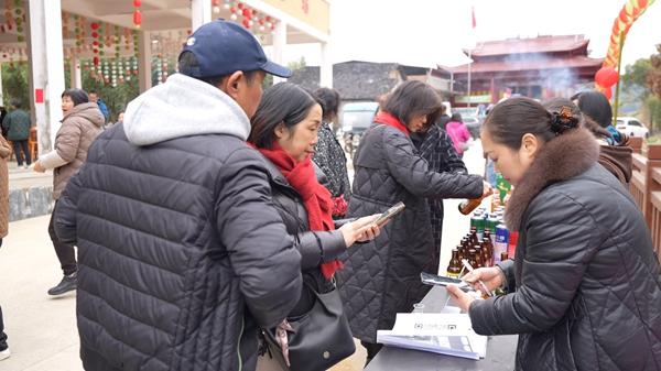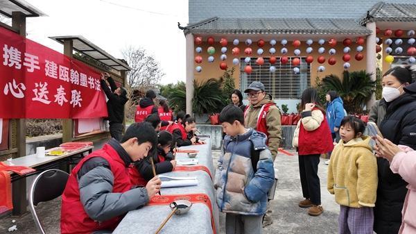 村内小公园的走廊路旁,乡村集市热闹开市,十余个展位整齐排开,本地农特产品、手工美食、传统工艺品一应俱全,吸引了众多来宾驻足品尝、挑选采购。集市上人潮涌动,叫卖声、交谈声交织相融,满溢着质朴又温暖的乡土烟火气。集市一侧,“写春联送福”文明实践活动同步开展,墨香阵阵间,一副副寓意吉祥的春联跃然纸上,承载着大家对新春的美好期许。一位从福州远道而来的游客感慨道:“我一早特意过来,东溪口村真是太热闹了!三个月前我来过一次,如今村子已是焕然一新、大变样。我们是公益组织,后续会为村里的乡村振兴多链接社会资源,让更多大学生志愿者和城市孩子走进这里,为村子注入更多新鲜活力。”