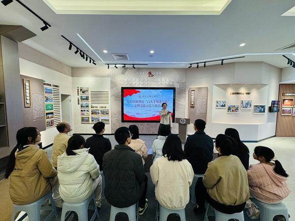 在南安市新时代文明实践中心开展的党的创新理论“百人千场进万站”文明实践示范宣讲活动现场,南安市“理响武荣”宣讲团成员、市世界文化遗产保护中心主任何春燕以《石刻照初心 丝路续新章》为题,为现场党员干部宣讲党的二十届四中全会精神。