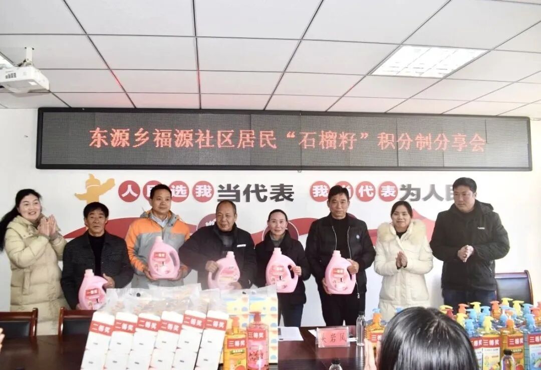 柘荣县东源乡福源社区召开“石榴籽”积分制居民分享会,评比积分靠前的居民领取礼品。