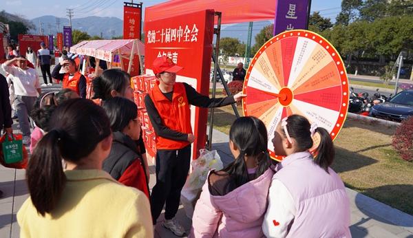 本次宣讲活动采用了群众喜闻乐见的“微宣讲”形式,并探索了“宣讲+文艺+服务+文创集市”的多元模式。现场设置了党的二十届四中全会“金句盲盒”“全会精神大转盘”等互动游戏体验区,吸引众多居民踊跃参与。刚参加完互动的大学生志愿者兴奋地表示:“这种寓教于乐的方式特别好,我在志愿服务中,也记住了很多全会金句。”