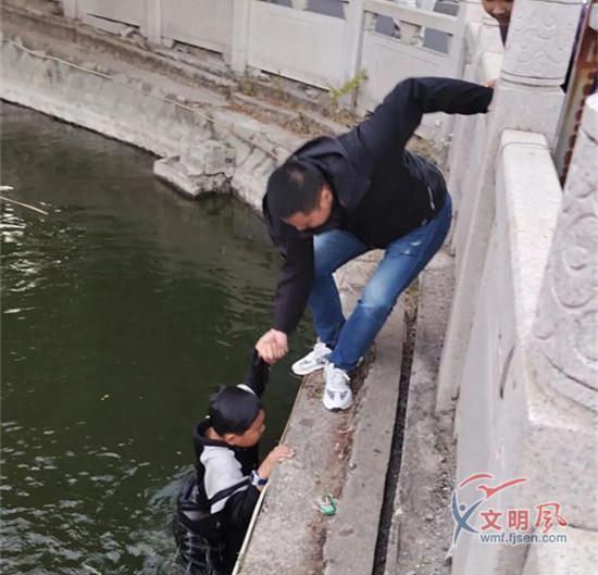 郑志标探身抓住落水孩童的手腕。翔安区委文明办 供图