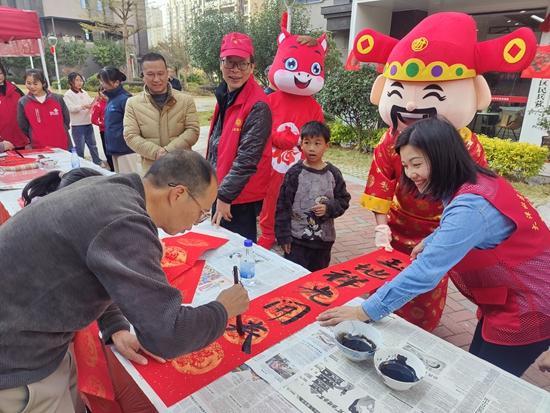 现场张灯结彩,笑语盈盈。活泼的“财神”人偶穿梭互动,送上新春彩头;“文明实践暖邻里 笔墨书香迎新春”的横幅下,数位书法爱好者展纸挥毫。楷书庄重、行书飘逸,一个个墨香馥郁的“福”字、一副副寓意吉祥的春联在笔尖绽放。志愿者们细心辅纸、晾晒,地面很快铺开一片红彤彤的“春意”。