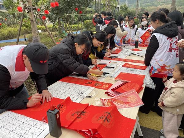 青年志愿勇担当,在写春联送福等活动中,返乡大学生志愿者各司其职,研墨铺纸、补充物资、引导排队,用青春力量添彩新春。依托“圩日”平台,青年志愿者开展义诊引导、义务理发、小家电维修等文明集市服务,用专业行动传递温暖。