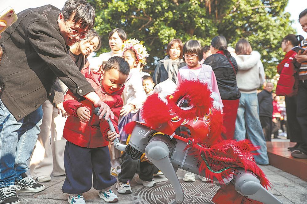 2月21日,机器狗亮相漳州古城,与八方游客零距离互动,大人小孩开心不已。郑文典 摄