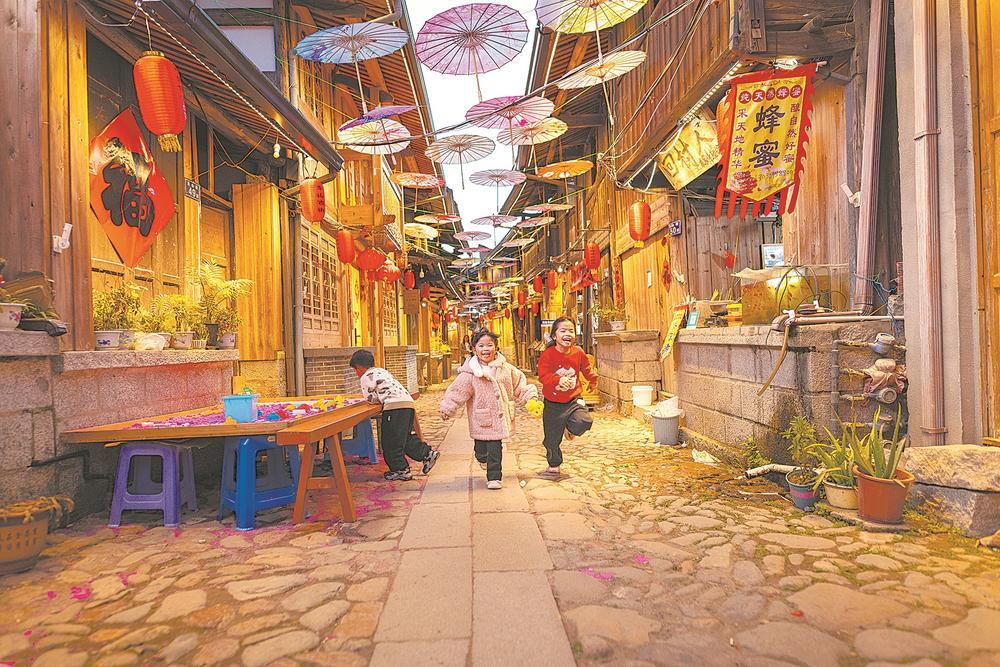 2月20日,宁德市蕉城区洋中镇东山古街,几名孩童在拥有千年历史的古街巷中尽情奔跑嬉戏。丁天霖 摄