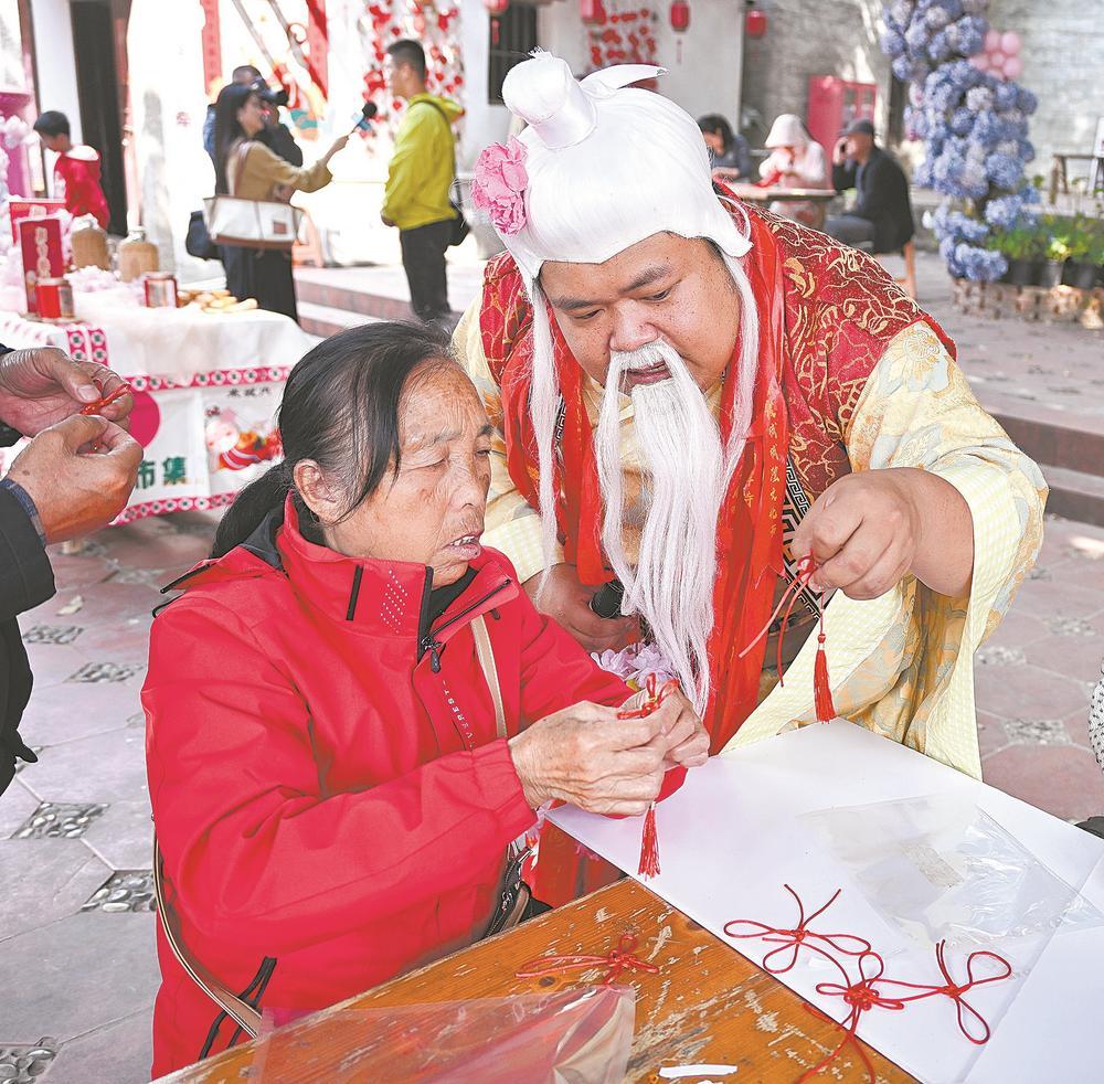 2月22日,厦门市集美区城内社,“马到厝边·趣祈福”新春年俗活动热闹上演,村民、台胞与游客欢聚在一起,沉浸式体验闽南年味,共赴两岸同欢的新春之约。图为身着月老形象服装的台青现场指导游客制作中国结。林志杰 摄