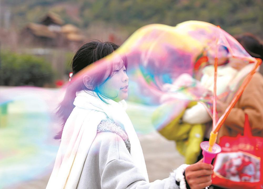 2月18日,南平市政和县石圳景区,市民们走出家门来到户外赏景、嬉戏、休憩,品尝美食,乐享年味。黄杰敏 摄