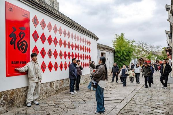 除了主舞台的视听盛宴,整个洞天岩景区的年味同样被“拉满”,游客们漫步景区,在百福墙前祈福许愿,随手一拍都是充满年味的大片。