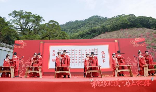 随着激昂的舞蹈《马到成功》在北溪文化广场上演,启动仪式正式开启。随后的“宋式古风集体婚礼”将活动推向最高潮。在漫山桃花的映衬下,数对新人身着宋代传统婚服,在司礼官的唱导下,依古礼牵巾入场、行拜天地礼、敬茶改口、结发盟誓。与以往奢华铺张的婚礼不同,这场婚礼简化了繁琐流程,却保留了核心的文化意蕴,以庄重典雅的仪式感替代了攀比浪费的浮华风,将新时代文明实践所倡导的“婚事新办、喜事简办”理念融入传统婚仪之中,让在场观众在感受传统文化之美的同时,也悄然接受了一场文明婚恋观的洗礼。