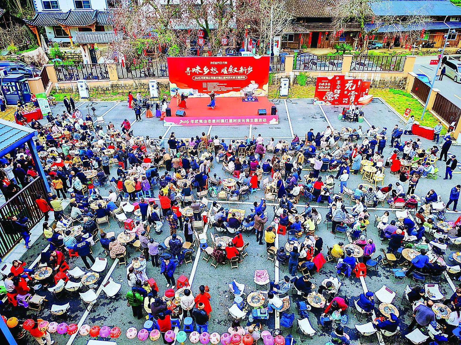 围炉煮茶、畲乡歌舞、点茶体验、灯谜互动、特产展销……3月2日,“寻味乡愁 暖叙新岁”庆元宵活动在武夷山星村镇红星村访客中心举办,市民游客在茶香与乡愁交织中欢聚一堂,看表演、猜灯谜、尝美食,共庆佳节。图为活动现场。 (张筱惜 摄)