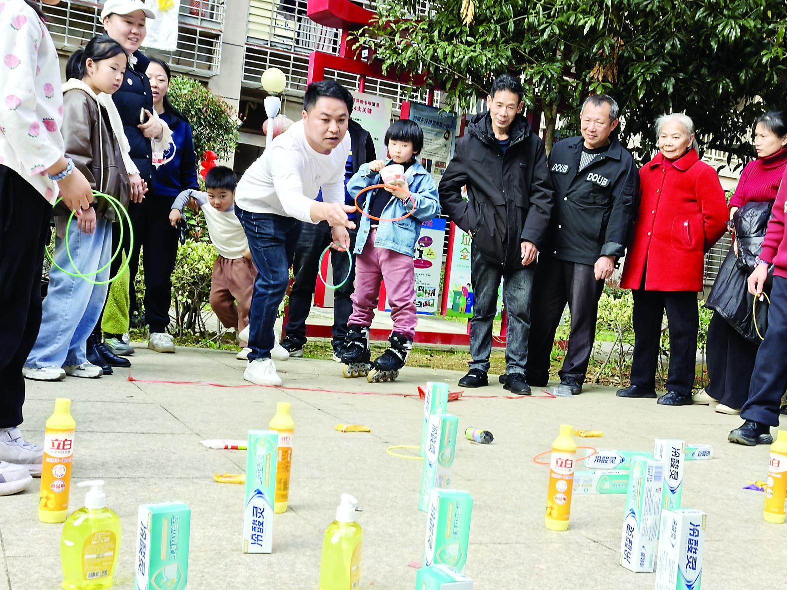 庆元宵,乐团圆,3月2日,建阳区崇泰街道童子山社区万晟星城小区内张灯结彩,猜灯谜、品元宵等活动吸引众多居民参与,共庆佳节。图为套圈游戏。(程若兰 黄慧聪 摄)