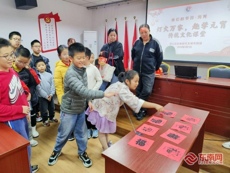 同一天,浔江社区新时代文明实践站里,“灯火万家,趣学元宵”传统文化课堂热闹开讲。“元宵黏福卡”拼手气,“福铲元宵”比手快,灯笼DIY拼创意。现场还穿插了“光盘行动”倡导和环保知识普及,让亲子家庭在实践中共树文明新风。