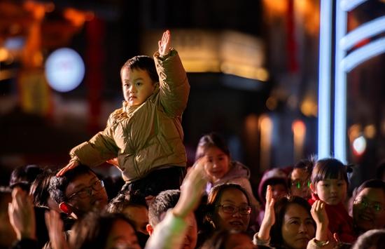 晚7时,“古街元宵主题音乐会”在五里古街激情开唱,本土乐队与文艺志愿者联袂献艺。与此同时,古街中段设置的“赛马捶丸”、“赶马入厞”等闽南传统趣味游戏区,成为孩子们的乐园,加油声、欢笑声交织成一曲欢快的节日交响。“妈妈快看,这是我玩游戏赢的!”9岁的一位小朋友高举小花灯,兴奋地说:“那个喷火的木偶太好玩了,比动画片还厉害!明年元宵我还要来!”