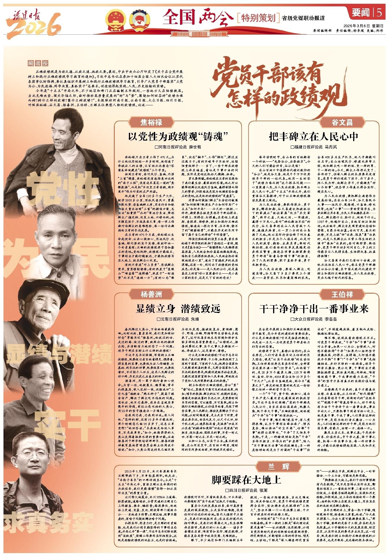 今年是“十五五”开局之年,不少地区和部门正在编制五年规划,一些地方又在陆续换届。当此克难攻坚、闯关夺隘之际,面对推动高质量发展的“时”与“势”,围绕如何回答好“政绩为谁而树?树什么样的政绩?靠什么树政绩?”,福建日报联动河南日报、云南日报、大众日报、四川日报,对照焦裕禄、谷文昌、杨善洲、王伯祥、兰辉五位典型人物的政绩观,论述——