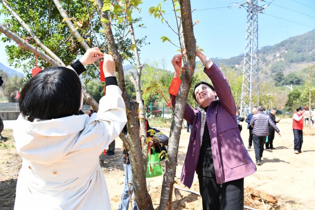 植树间隙,姐妹们还纷纷在心愿卡上写下“两岸一家亲”“同心筑梦,共向未来”等美好期许,并将卡片系于枝头。红绸与绿叶相映,传递着两岸同胞的深厚情谊。